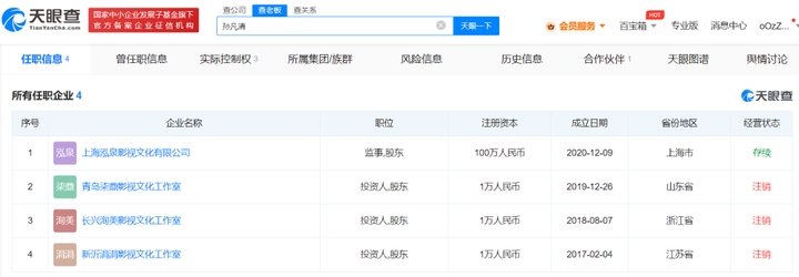 天眼查App顯示,宋祖兒(孫凡清)共關聯4家企業,其中,由其個人獨資的青島柒鼎影視文化工作室、長興洵美影視文化工作室、新沂涓涓影視文化工作室均已注銷,目前存續狀態僅剩上海泓泉影視文化有限公司1家。